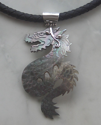 | Descriptions | :  | dragon style carving made from mop black shell with silver 925 holder and string rubber with silver mot |