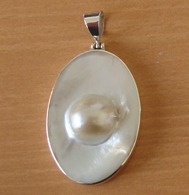 | Descriptions | :  | round pearl in oval mop pendant with silver |