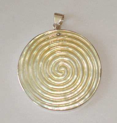 | Descriptions | :  | round yellow mop shell silver pendant with baygon carved |