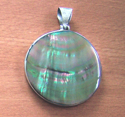 | Descriptions | :  | round pink mop shell silver pendant |