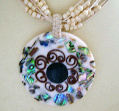 | Descriptions | :  | paua shell mosaic with round black mop shell inside necklace with bead |