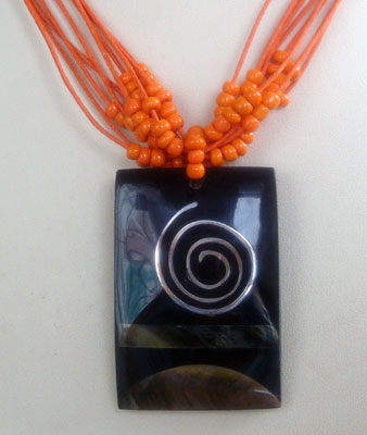 | Descriptions | :  | black mop shell in black receine necklace with orange bead and string |