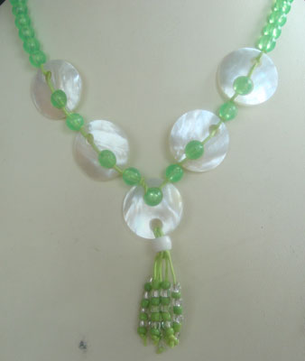 | Descriptions | :  | round white mop shell necklace with green bead string |