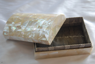 | Descriptions | :  | box combine with snake leather we sell by pcs with the above price using white pure shell white mother of pearl art |
