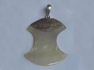 | Descriptions | :  | mother of pearl shell cut becoming flat holder with silver pendant |